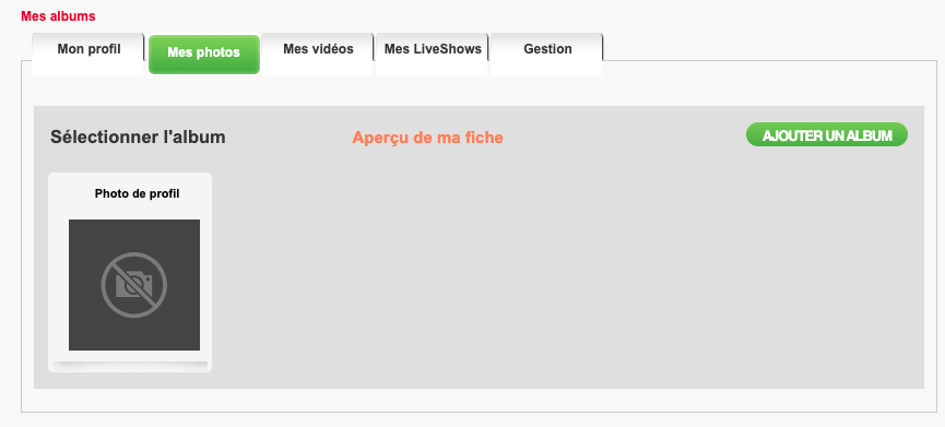 Via la rubrique “Mon profil”, vous pouvez accéder à différents onglets comme “Mes photos”, “Mes vidéos”, “Mes LiveShows” vous permettant de partager avec la communauté des éléments multimédia comme des photos et vidéos de vous.
